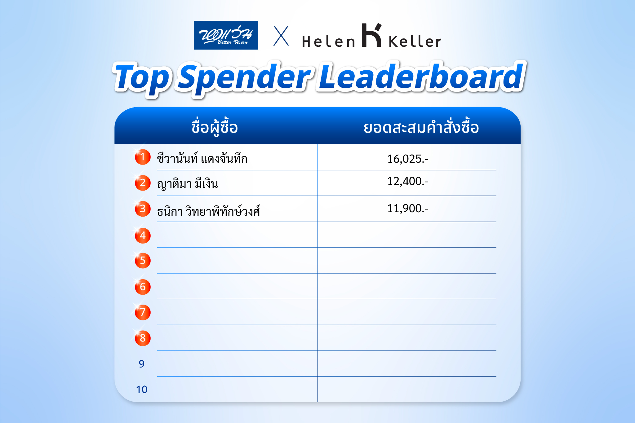 - วันที่ 16 และ 25 กุมภาพันธ์ จะมีการอัปเดตผู้มียอดสะสมสูงสุด 10 ท่านในหน้าเว็บไซต์นี้